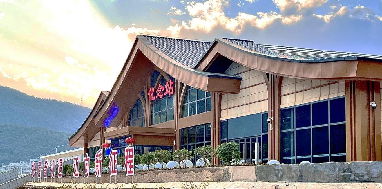 化念站設計理念以“玉磨明珠、秀翼化念”為主題,整體造型源于對化念秀山綠水文化的傳統(tǒng)元素發(fā)掘提煉,以現代精神的浪漫風格的設計手法,結合傳統(tǒng)材料的表現,展現出化念的地理與人文風情。設計源自當地民居屋頂和樹的形態(tài),并提取當地民族特色紋樣進行設計組合演繹,在室內空間中展現當地民族文化特色。