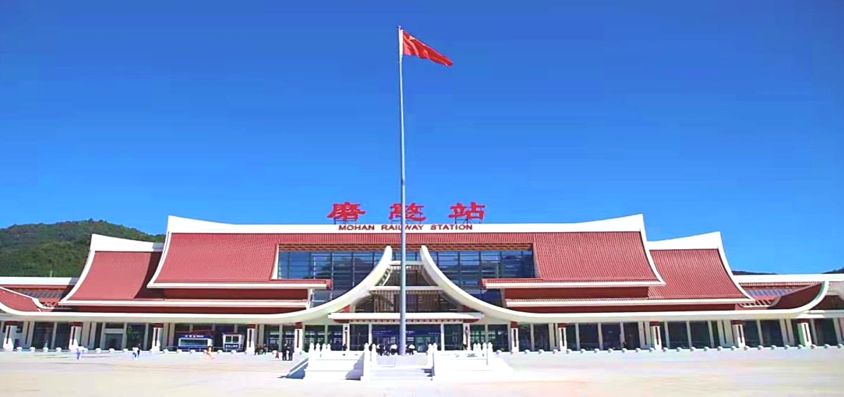 11.磨憨站位于云南省磨憨經濟開發(fā)區(qū)尚勇鎮(zhèn)東側,距鎮(zhèn)中心約1公里。車站為線側下式站房,總建筑面積為15768平方米,最高聚集人數為600人,站房主體一層,兩側二層,局部地下一層。旅客乘降站臺2座、到發(fā)線3條,目前進站口分為國內出發(fā)、國際出發(fā),出站口分為國內到達、國際到達。采用驗檢分開的進站檢票模式。設國內候車區(qū)、國際候車區(qū)、商務候車室、行政貴賓室、母嬰候車室及重點旅客候車區(qū)。