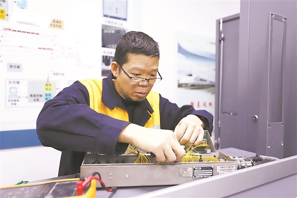 此后3個月,他每天下班后多留一小時,繪制電路原理圖,推演電路邏輯,常為設(shè)定一個參數(shù)熬至深夜。為了確定最佳電源電壓,他連續(xù)一周開展測試,數(shù)據(jù)記滿3個筆記本。沒有專用工具,他就用銼刀、烙鐵手工制作;信號傳輸不穩(wěn)定,就一次次調(diào)整電路布局。經(jīng)過反復(fù)改進(jìn),他成功搭建起車載設(shè)備室內(nèi)檢修試驗平臺。車間副主任付瑜忠評價說:“有了這個平臺,不用上車就能完成TAX等設(shè)備檢修和模擬試驗,大幅提升了檢修效率。”