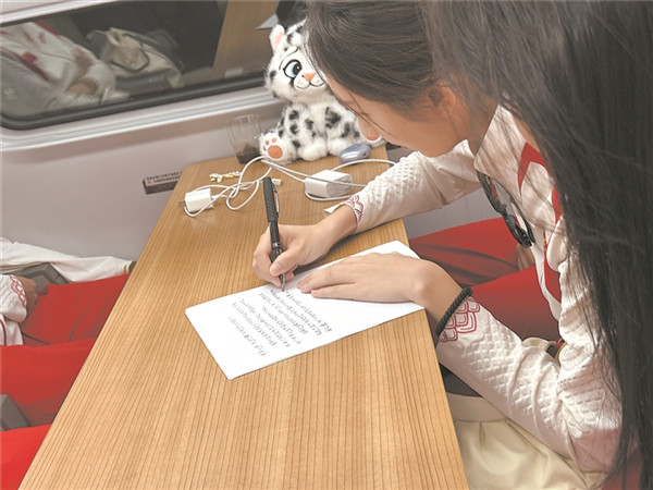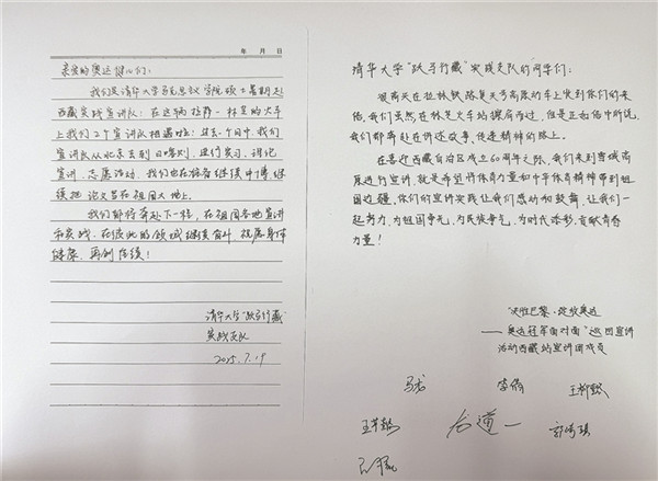此前,四位同學(xué)已看過(guò)奧運(yùn)冠軍在林芝的宣講新聞,能在列車上與冠軍“隔空相遇”,讓他們既驚喜又遺憾。因?qū)嵺`支隊(duì)需趕往下一站開展宣講和志愿活動(dòng),他們沒有時(shí)間與冠軍們當(dāng)面交流?!皟芍v隊(duì)伍,一個(gè)在學(xué)術(shù)領(lǐng)域刻苦鉆研,一個(gè)在體育賽場(chǎng)上不懈拼搏,我們都在為建設(shè)祖國(guó)而奮斗?!睂?shí)踐支隊(duì)隊(duì)長(zhǎng)左宏量說(shuō)。當(dāng)隊(duì)員王珺儀提議寫一封信轉(zhuǎn)交奧運(yùn)冠軍時(shí),大家都為這個(gè)想法感到興奮,迅速著手起草。信中,四位清華學(xué)子寫下了他們的心聲: