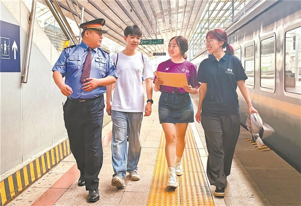 Z22次列車長(zhǎng)司文東在北京西站交付信件后與清華學(xué)子合影。李 磊 攝