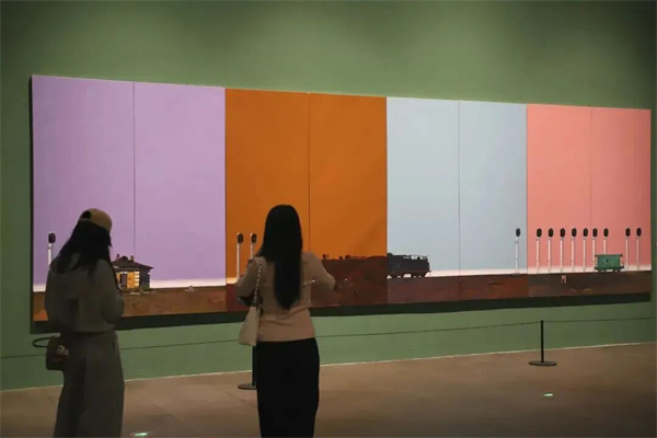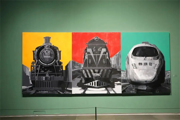 序廳以《奔騰·歲月》開(kāi)篇,描繪中國(guó)鐵路發(fā)展的重要階段。作品中的機(jī)車(chē)主體以黑、白、灰為主色調(diào),盡顯硬朗雄厚的力量感;而背景的紅、黃、綠三種高飽和度純色,則為機(jī)械的冰冷感賦予了強(qiáng)烈的當(dāng)代視覺(jué)沖擊力。觀(guān)眾得以從中國(guó)鐵路的巨變中,真切感受到中國(guó)的飛速發(fā)展和時(shí)代變遷。