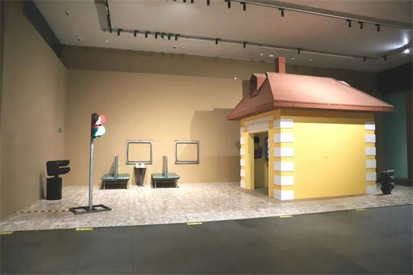 展廳中,一件名為《站臺(tái)》的大型裝置作品尤為引人注目。作品以東北地區(qū)火車(chē)扳道房為原型,淺紅褐色屋頂與赭石色墻體復(fù)刻了工業(yè)記憶,地面如白雪覆蓋,搭配綠皮火車(chē)座椅、茶幾與模擬車(chē)窗,再輔以信號(hào)燈的光影點(diǎn)綴,讓每一位觀(guān)眾都能成為這段旅途中的風(fēng)景,完美詮釋了“場(chǎng)域性景觀(guān)”的藝術(shù)構(gòu)想。
